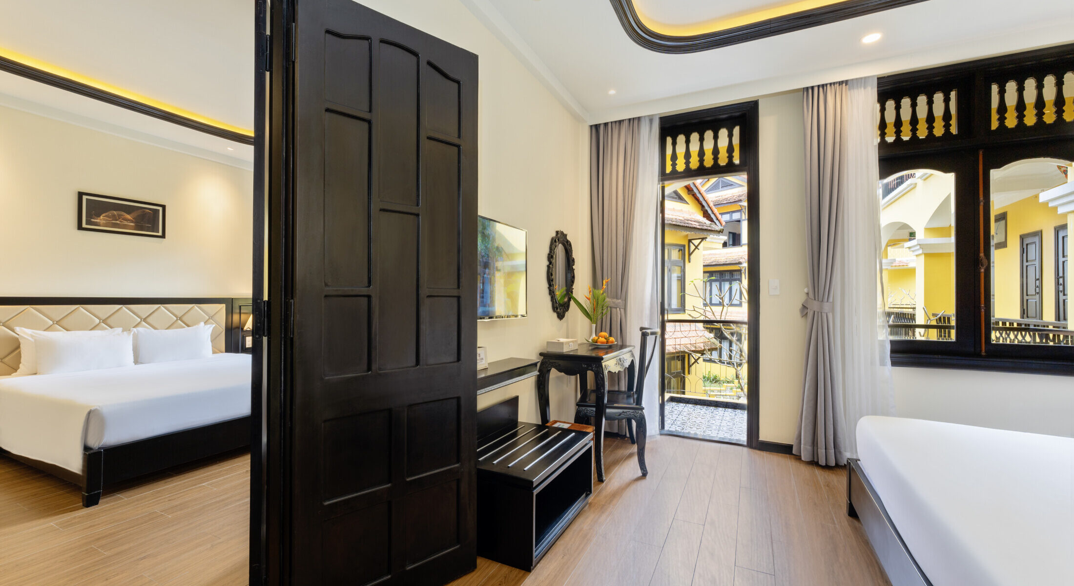 Cảm nhận sự tươi sáng Hội An qua sắc vàng cùng với tông gỗ trầm ấm tạo nên sự ấm áp cho kỳ nghỉ của bạn.